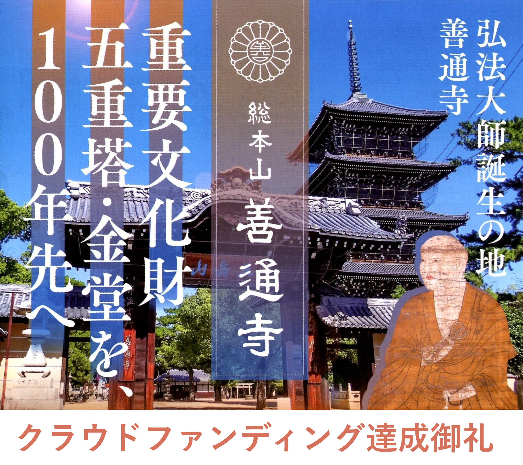 4月1日(火)~5月30日(金)の期間に挑戦いたしましたクラウドファンディング(重要文化財「五重塔」「金堂」の防災施設改修事業)につきまして、全国の皆から温かいご支援賜り、5月23日(金)に目標金額1500万円達成し、そして第二目標(NEXT GOAL)である目標金額2000万円も5月30日(金)に達成する事ができました。私たちのプロジェクト『弘法大師誕生の地 善通寺重要文化財 五重塔・金堂を、100年先へ』に温かいご支援を賜り、心より御礼申し上げます。