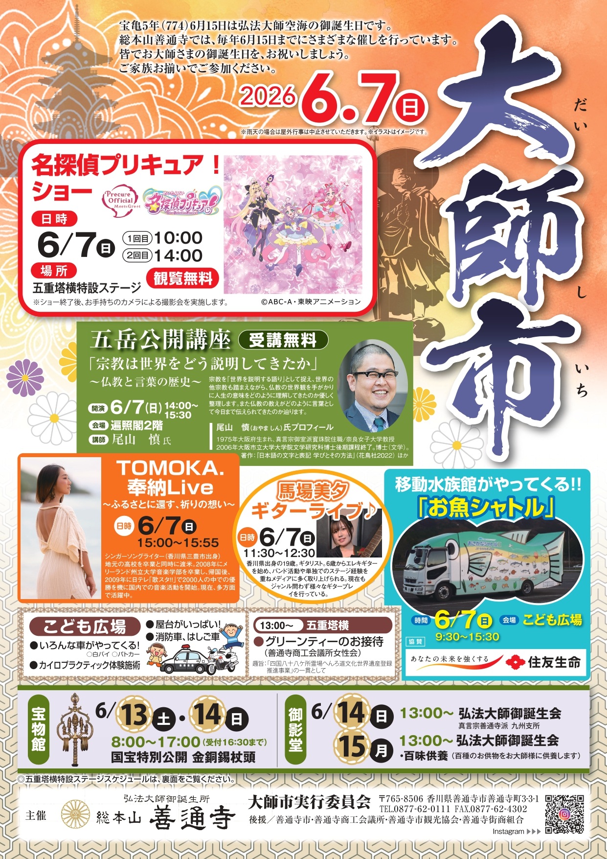 大師市のお知らせ 2026.04.27 Tweet Share 宝物館の展示替えについて 新着記事 お知らせ一覧 2026.04.26 宝物館の展示替えについて 2026.04.21 まおかふぇお臨時休業のお知らせ【4月24日(金)】 2026.04.17 仁王門土壇の修復にともなう仁王さまの移設 2026.04.13 【再公告】重要文化財善通寺金堂及び五重塔防災施設整備事業の一般競争入札 2026.03.30 まおかふぇお休みのお知らせ【4月12日(日)】